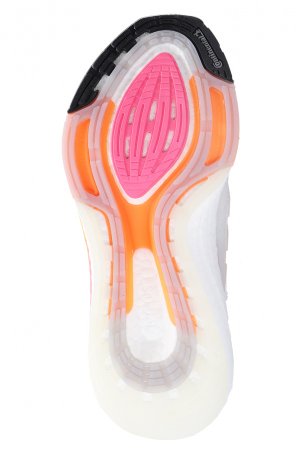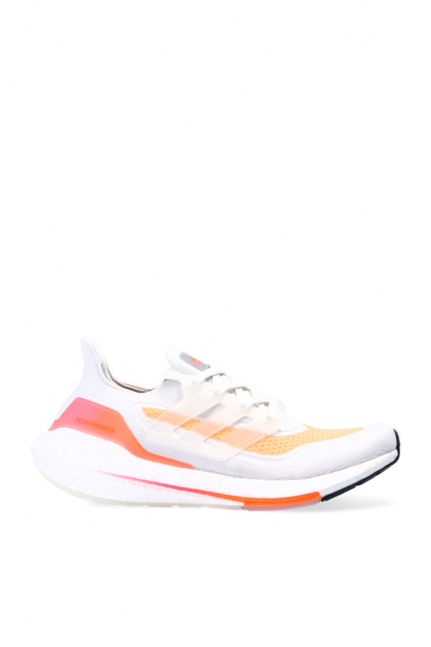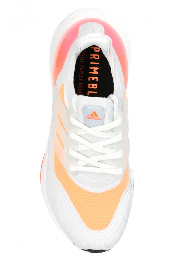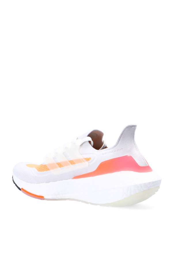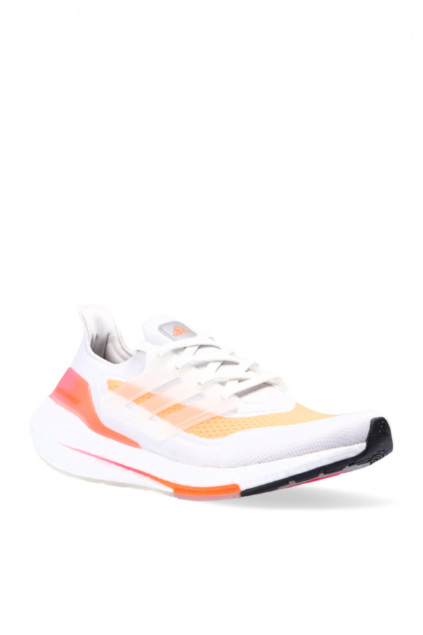Light grey and orange ‘UltraBOOST 21’ sneakers from ADIDAS Performance, Primeblue line. Featuring a Primeknit+ upper, this lace-up design features a logo appliqué on the tongue, the iconic three stripes on the sides and a white Stretchweb sole in Continental™ rubber with 6% more Boost capsules and the new Torsion System, which provides a 15% increase in forefoot bending stiffness for a more responsive run. Primeblue is a performance fabric made with Parley Ocean Plastic, which is created from recycled plastic waste intercepted from beaches and coastal communities before it reaches the oceans. Products made of Primeblue contain a minimum of 40% recycled material in total.