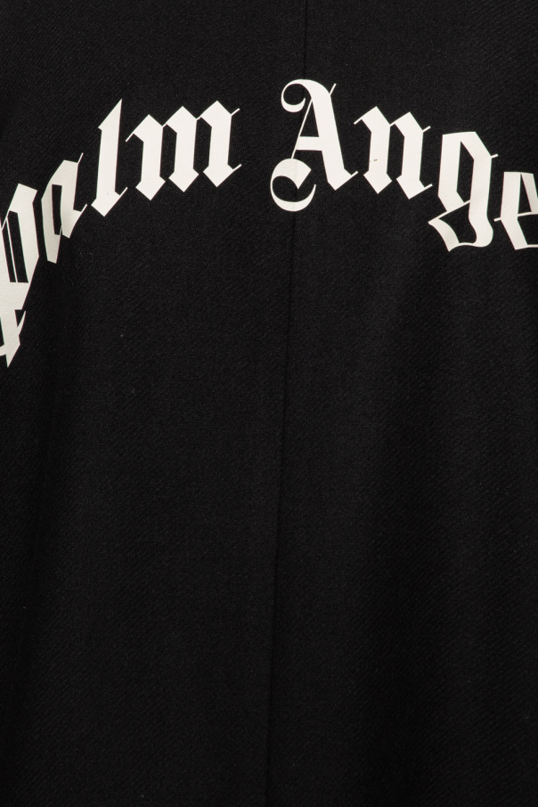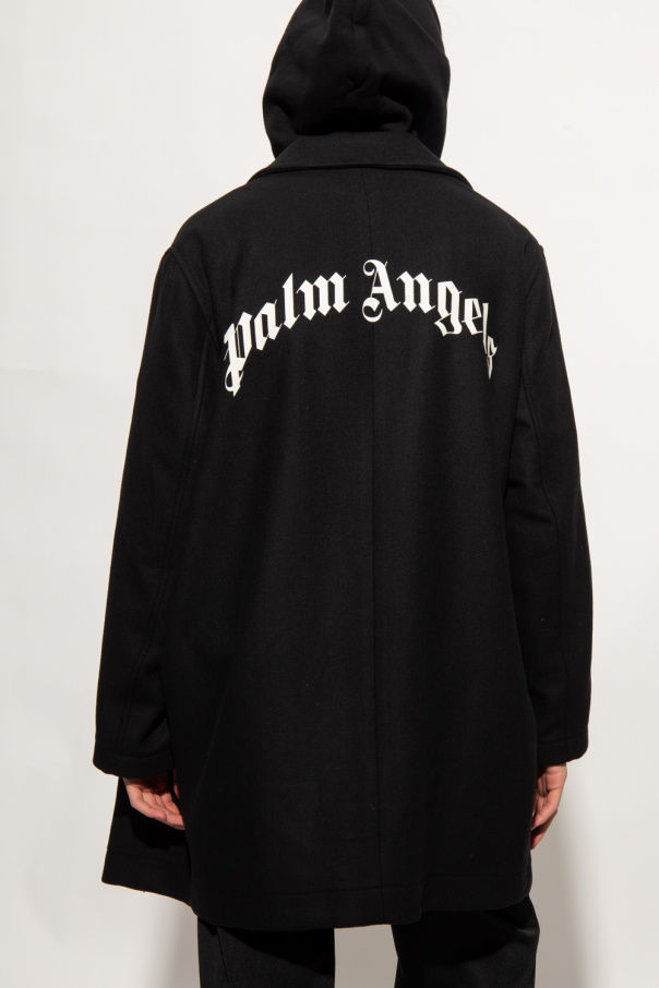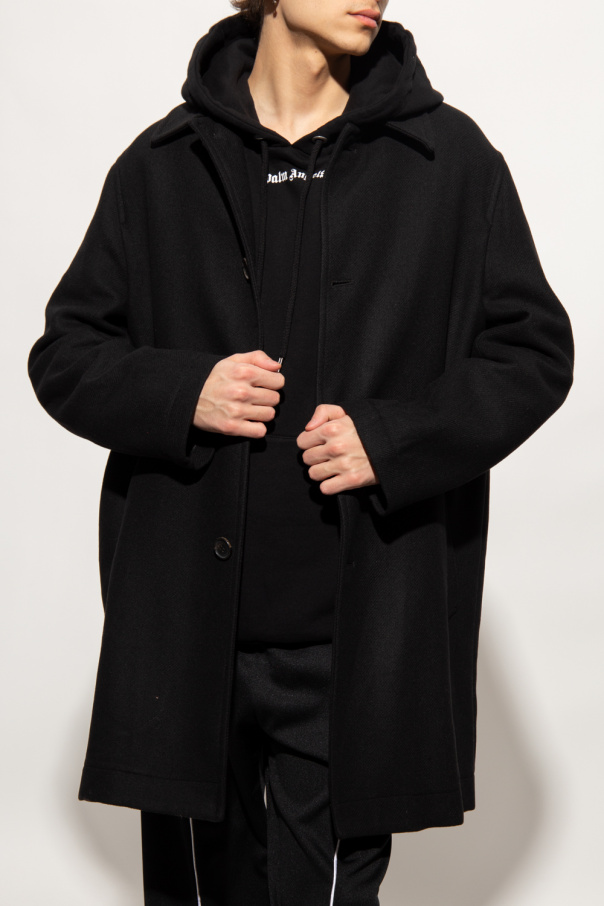 Black coat with a collar from Palm Angels. Fastened with buttons, this long sleeve design is complete with a white logo print at the back and two slip pockets.