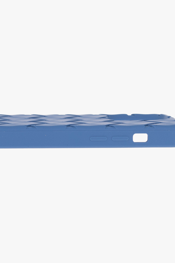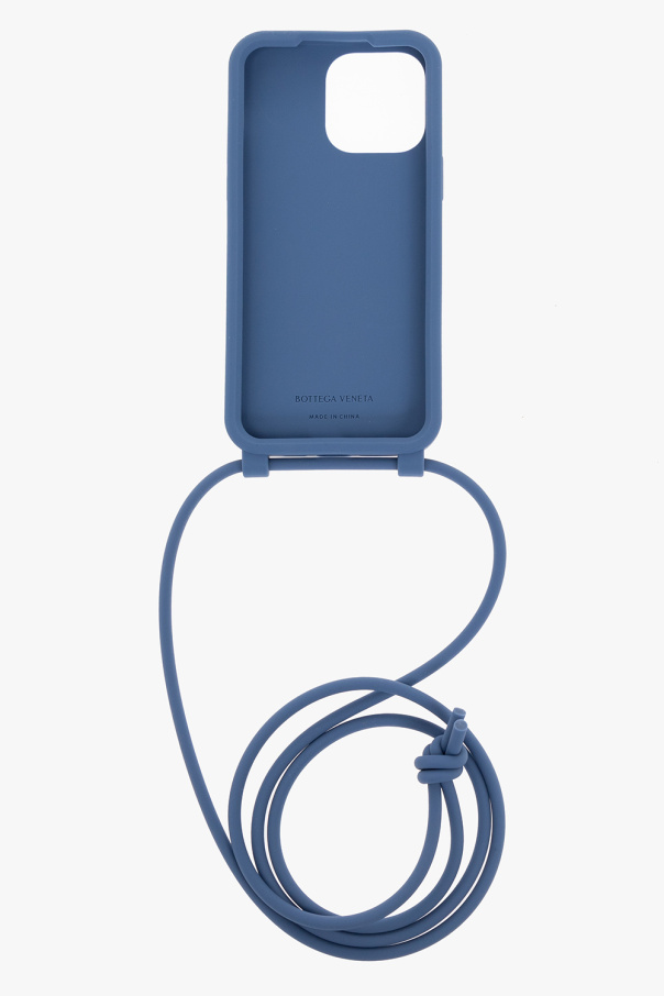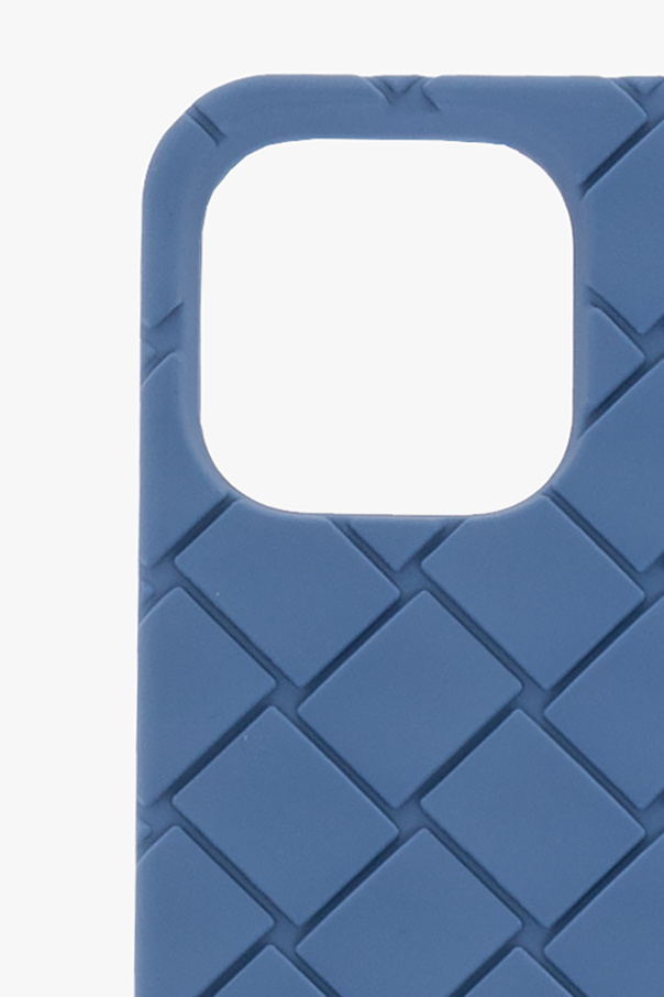 Blue iPhone 14 Pro Max case from Bottega Veneta. Made of silicone with a tactile ‘Intreccio’ weave design, this item features an attached straps.