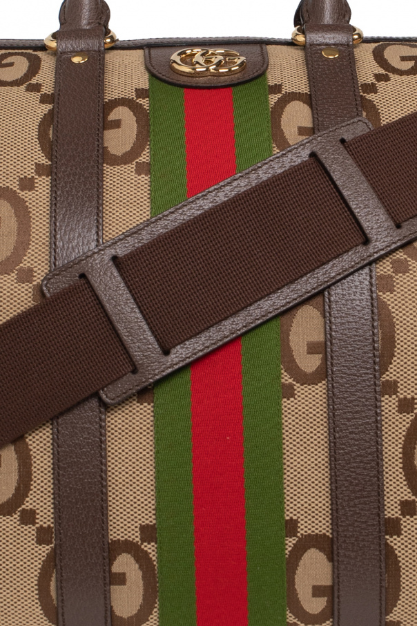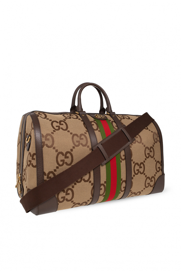 Beige and brown ‘Ophidia’ duffel bag from Gucci. Crafted from GG Originals canvas and trimmed with calf leather, this design secures with a two-way zip and features logo hardware and the brand's signature green and red Web stripe detailing, two half-round handles, a detachable and adjustable shoulder strap, gold-tone metal elements and one internal compartment with a zip pocket.