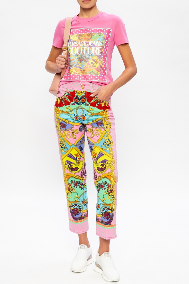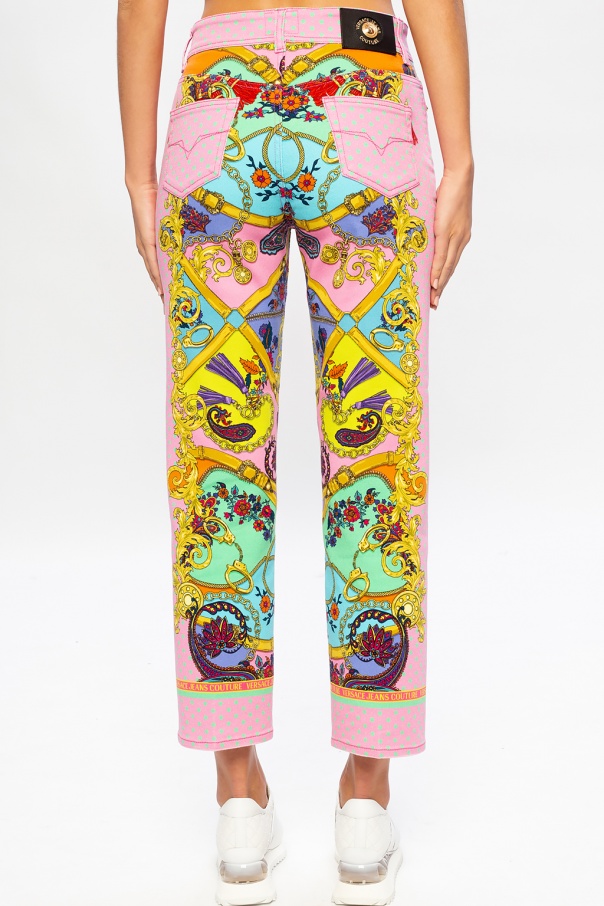 Multicoloured jeans from Versace Jeans Couture. Illustrated with the label's signature pattern, this pair falls down with straight legs and employs zip fly with top button fastening and five pockets.