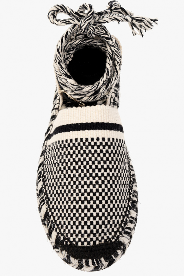 Black and white ‘Meril’ espadrilles from Chloé. Made of fabric and leather, this pair is complete with an embroidered geometric pattern, buckled ankle strap and rubber sole in beige and black. Created in partnership with Amambaih, a social enterprise whose mission is to offer income-generating employment opportunities to the Maka artisan community in Paraguay. Faithful to the unique Maka designs, all the braids and textiles used to create the Meril sandals were woven by hand, giving them their unique, irregular character.