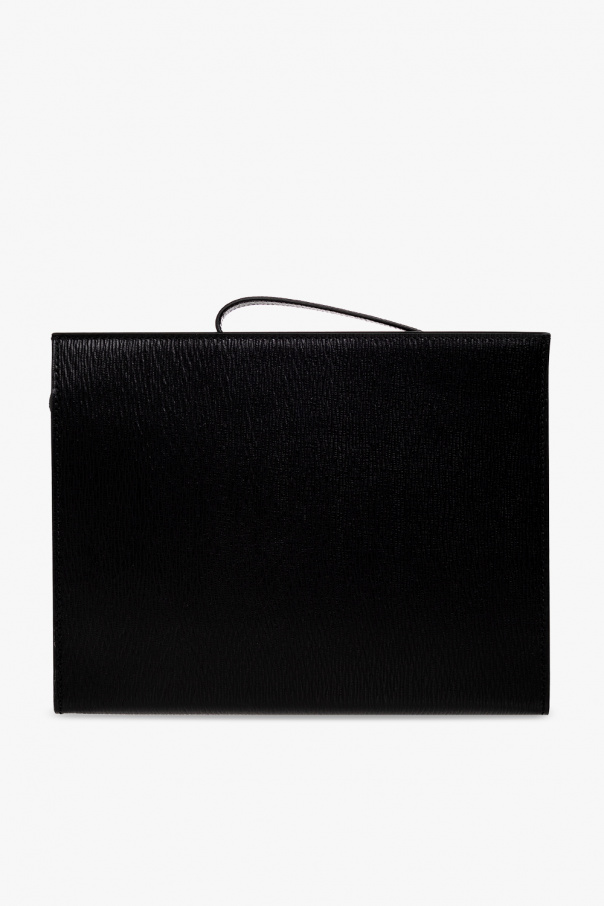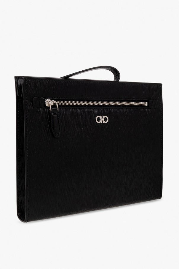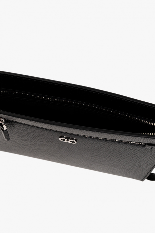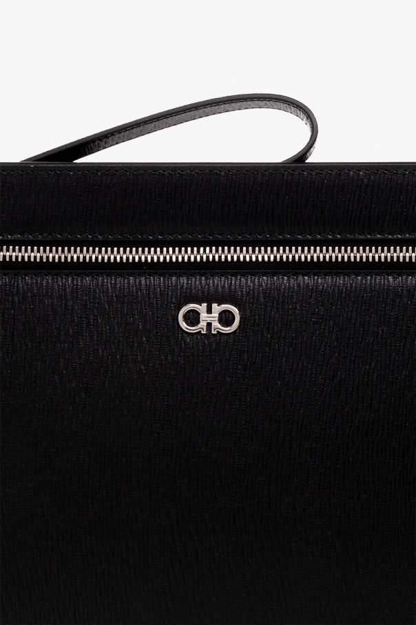Black handbag from Salvatore Ferragamo. Made from textured calf leather, this design secures with a zipper with a wrist strap and features a Gancini plaque accompanied by a zip pocket on the front, silver-tone metal hardware and one internal compartment with two slip pockets.
