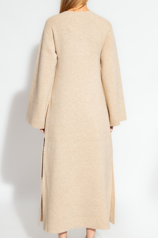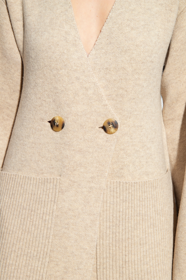 Beige ‘Carlyn’ double-breasted cardigan from By Malene Birger. Fastened with buttons, this garment is complete with two pockets on the front, a V-neck, long, wide sleeves and slits on the sides.
