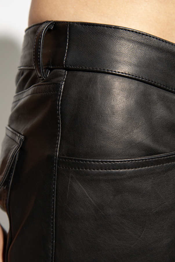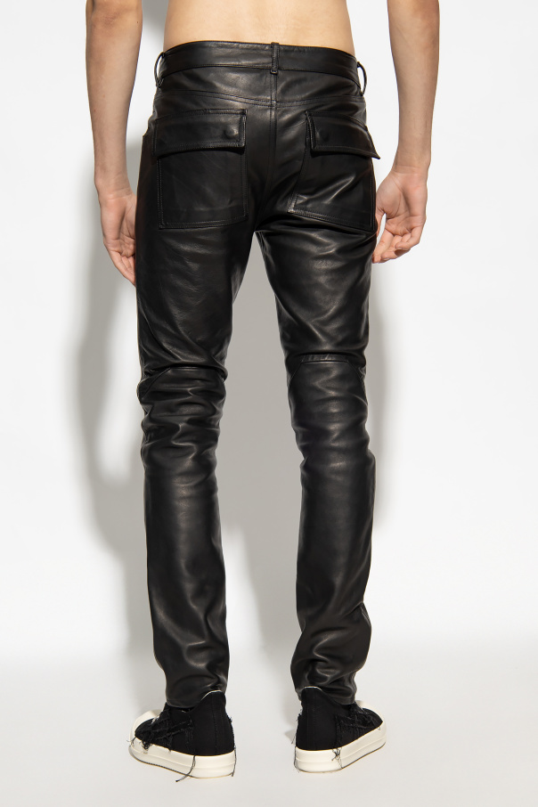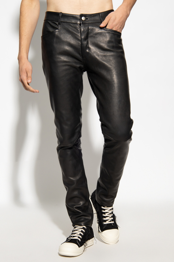 Black ‘Tyrone’ trousers from Rick Owens. Made from lamb leather, this pair falls with slightly tapered legs and features button fastenings, two slip pockets, two flapped pockets and distinctive stitching details at knees.