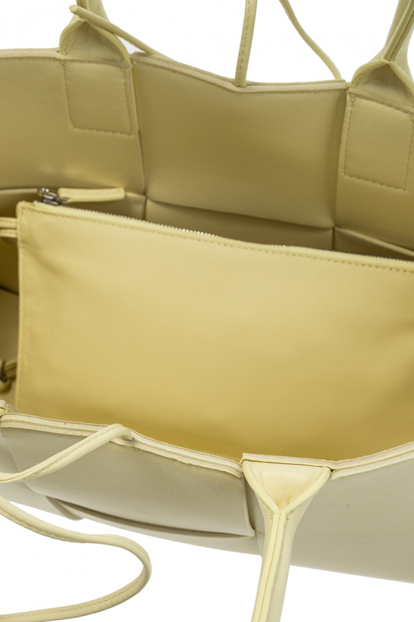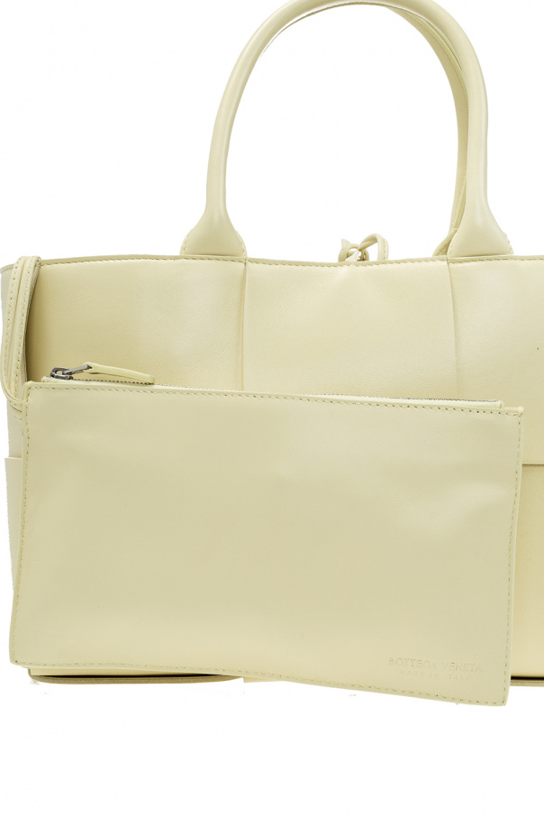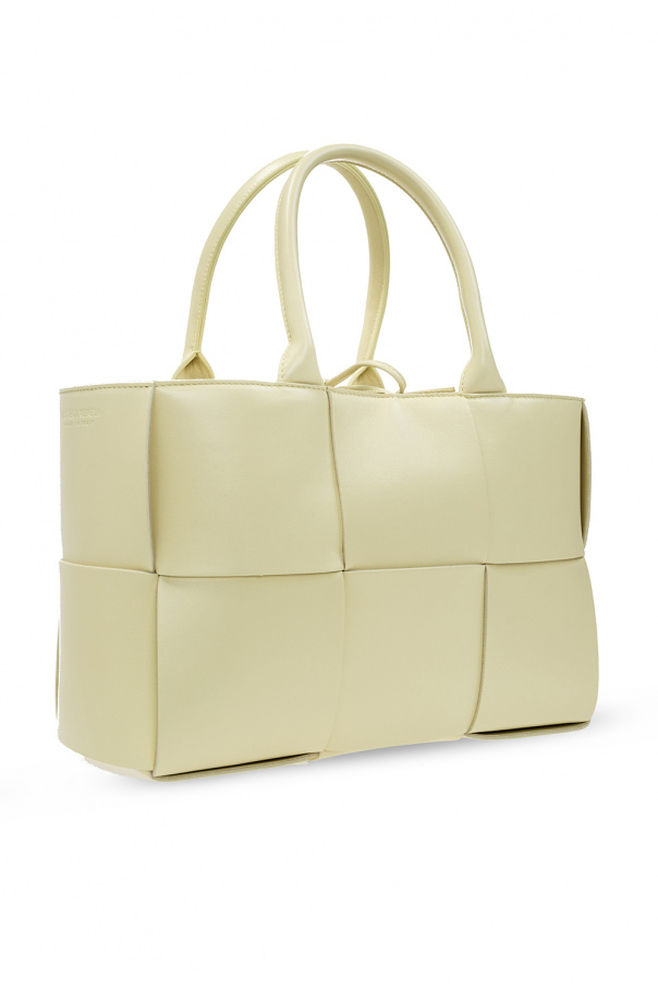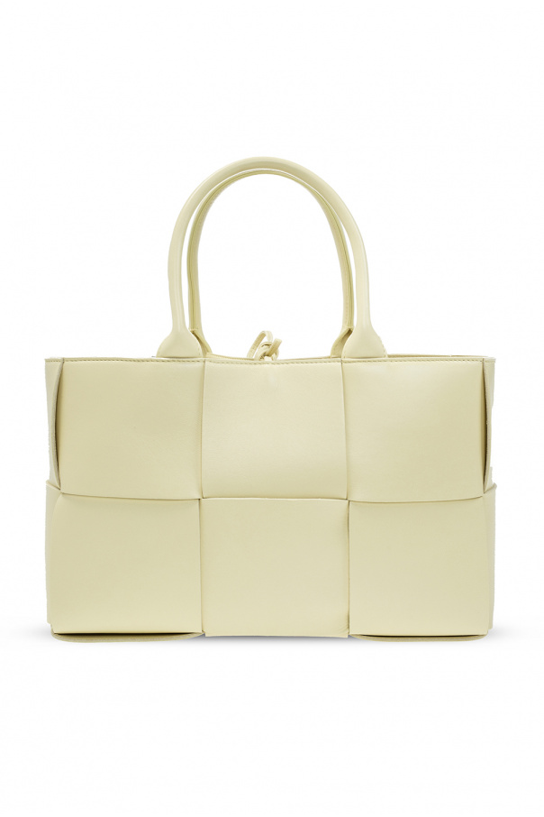 Cream ‘Arco Tote Small’ hand bag from Bottega Veneta. Crafted from lamb and calf leather with the iconic Intrecciato weave, this model is complete with two half-round handles and one internal compartment with a removable zipped pouch.