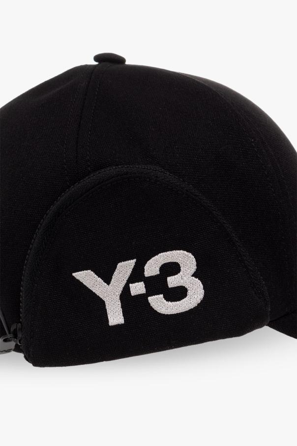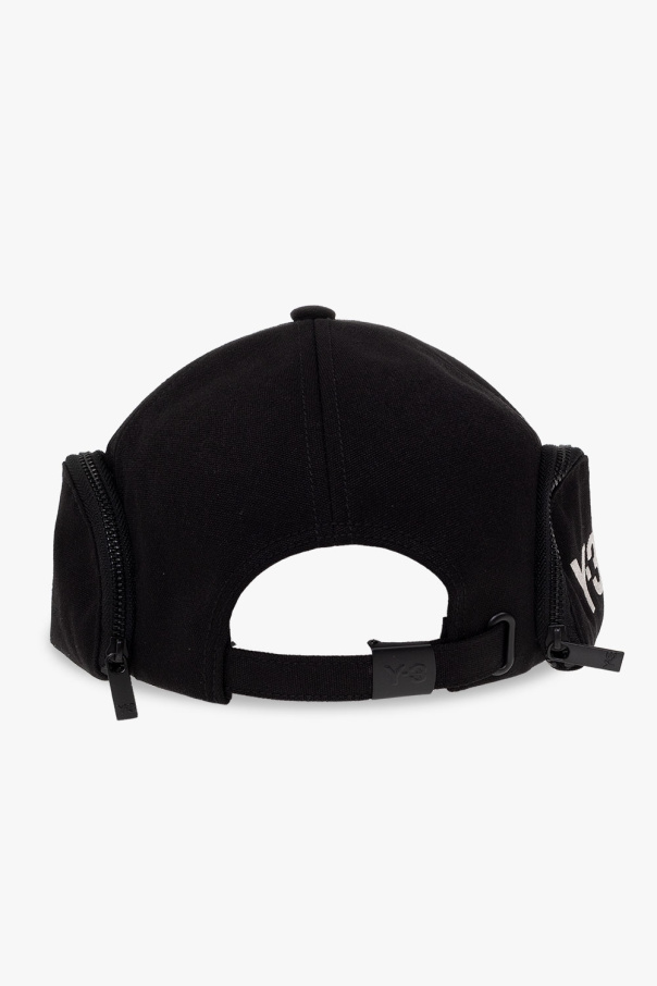 Black baseball cap from Y-3 Yohji Yamamoto. Crafted from recycled material, this item features zip pockets on the sides – one is embroidered with a white logo, and a buckle adjuster at the back.