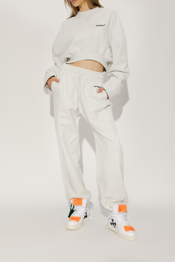 White ‘3.0 Off Court’ sneakers from Off-White. Made of leather, this lace-up pair features an Arrows patch, perforations on the front, the brand's signature zip tie in dark green and cream rubber sole.