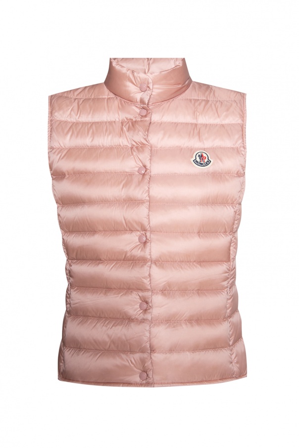 Pink ‘Liane’ quilted down vest from Moncler. Fastened with snaps, this design features a cream, red and navy logo patch and two front zip pockets.