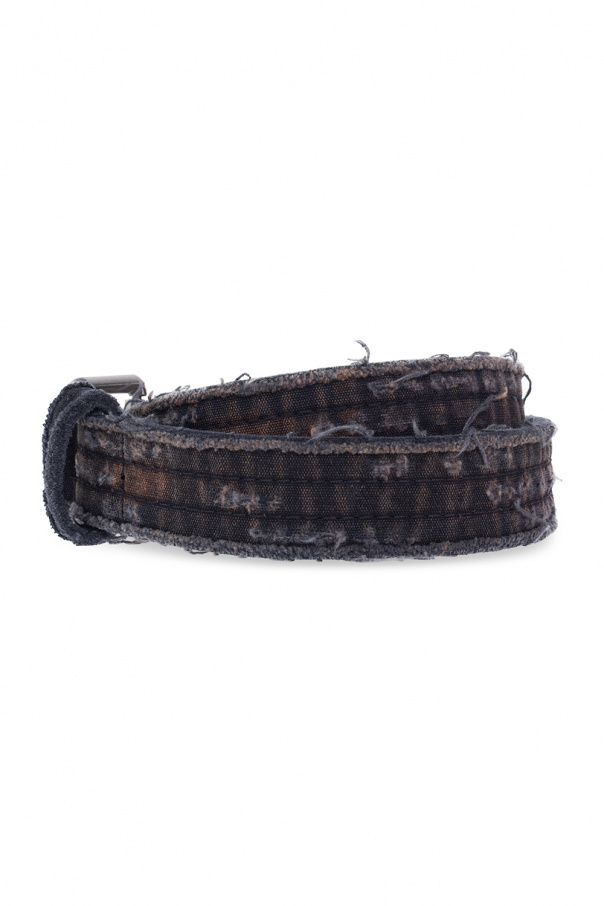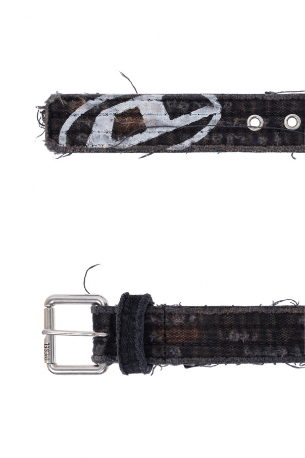Black 'B-D DESTROY' multi-layered belt with vintage effect from Diesel. Made of distressed raw trims with raw cut edges, this item features a silver-tone logo-embossed buckle and white logo print.