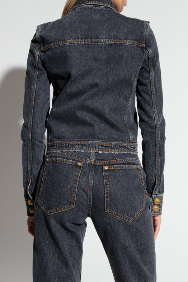 Grey denim jacket from Balmain. Made of cotton with a vintage effect, this style features gold-tone buttons with an engraved lion, two slip pockets, two flapped pockets and long sleeves.
