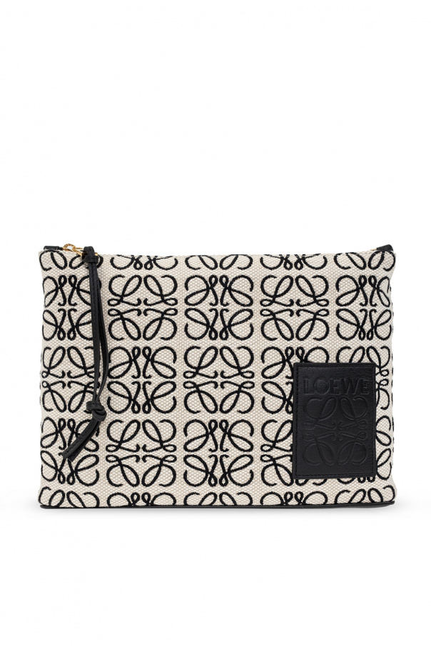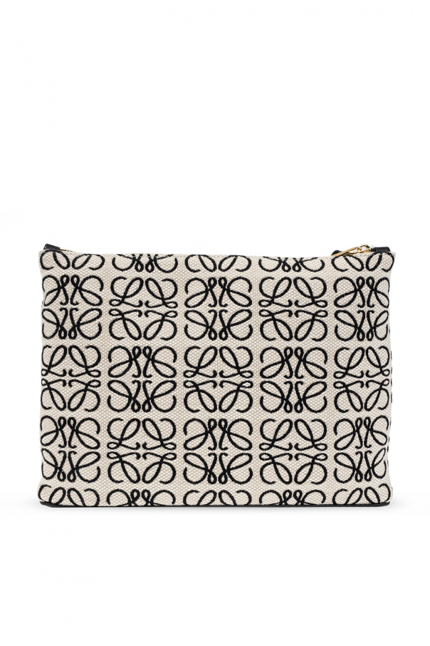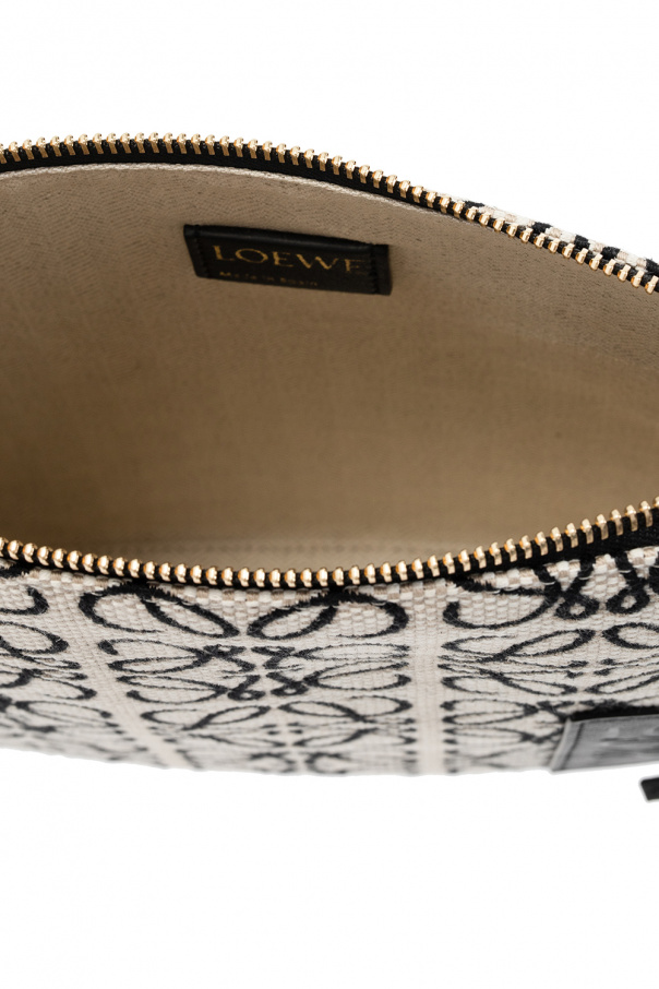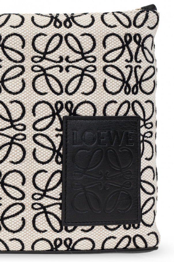 Beige and black pouch from Loewe. Crafted in an Anagram jacquard with calf leather trims, this item features a zip fastening, a black leather patch, gold-tone metal hardware and one internal compartment.