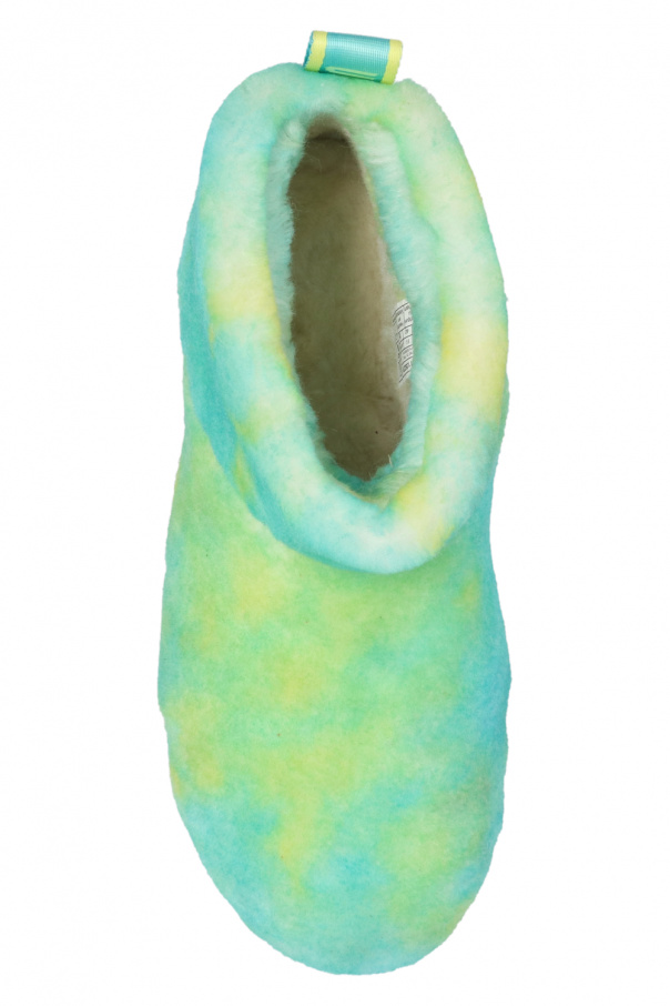 Green, yellow and blue ‘Classic Repeated Mini’ snow boots from UGG x Tschabalala Self. Made of leather, this model features a pattern details inspired by Tschabalala’s sculpture ‘Loner’, logo-embroidered fabric strap and light grey Treadlite by UGG™ sole made of rubber. The model comes from UGG’s collaboration with American artist Tschabalala Self known for her depictions of Black female figures using paint, fabric, and discarded pieces of her past works.