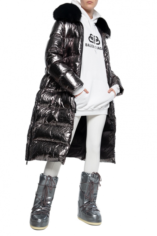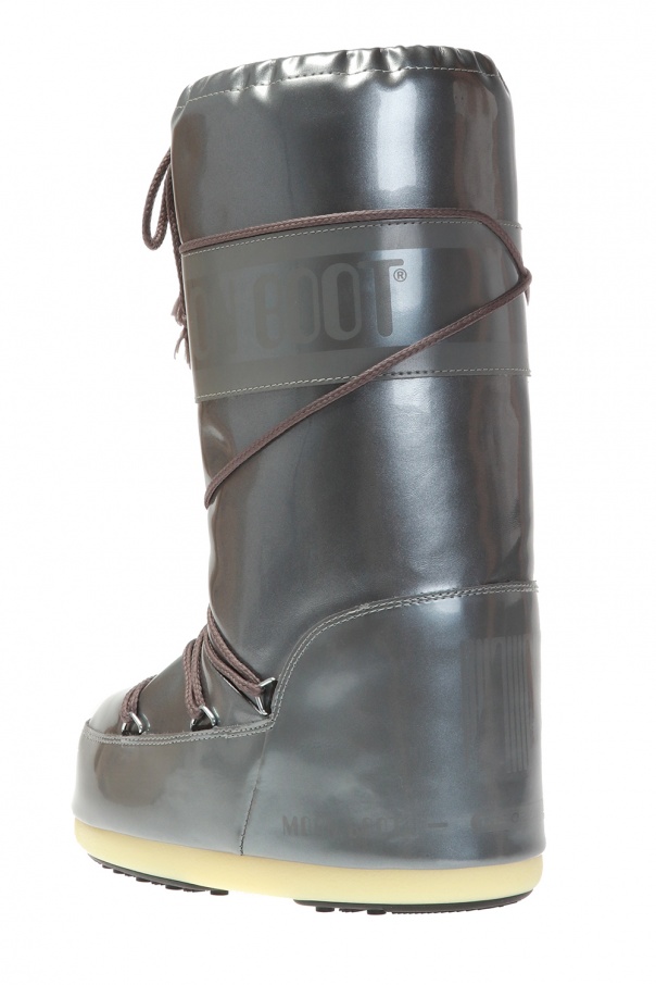 Silver-tone ‘Classic Vinil’ lace-up snow boots from Moon Boot featuring printed grey pattern with logo and beige and black rubber sole at the base.