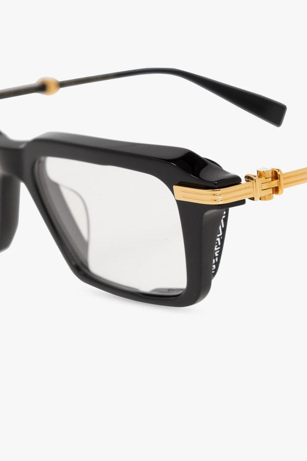 Black, clear optical glasses from Balmain. This pair features a perforated logo as well as gold-tone temples and details. Comes with a case.