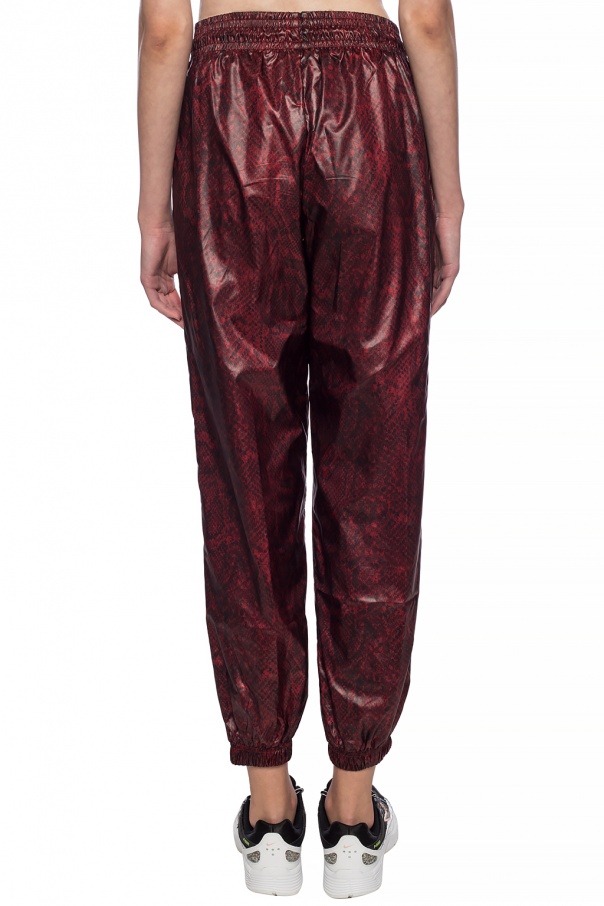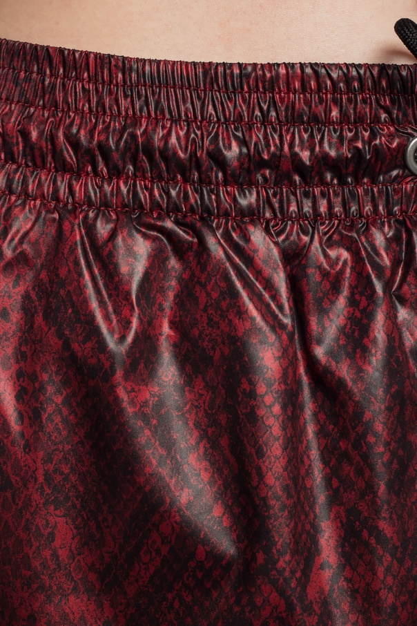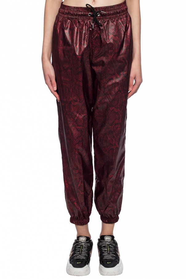 Maroon and black polyester sweatpants from Nike. Drawstring waist. Decorated with a snake motif pattern. Black logo print on the front. Two slip pockets on the sides. Elasticized cuffs. Mesh lining.