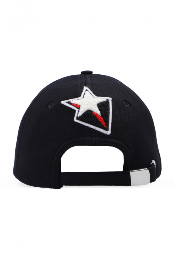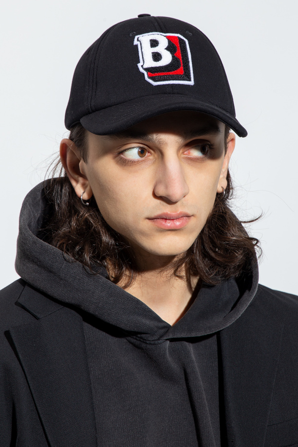 Black baseball cap from Burberry. Made of cotton. Decorated with a black, white and red logo patch and a star motif. Adjustable strap at the back.