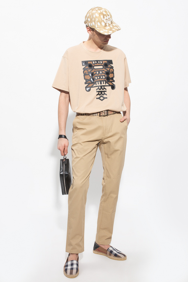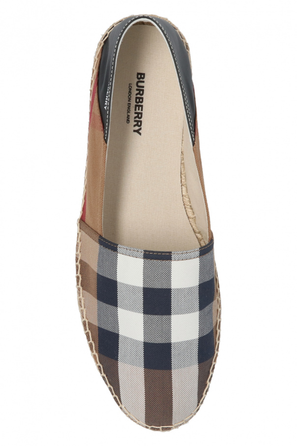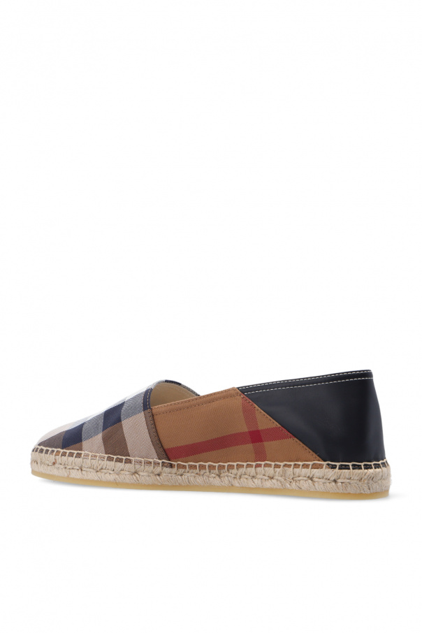 Beige, black and brown espadrilles from Burberry. Made of leather and fabric, this pair features the iconic check, white logo print and beige rubber sole.