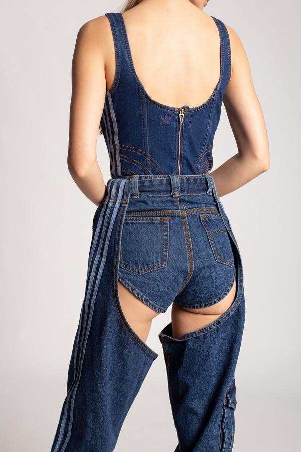 Navy denim body with straps from ADIDAS Originals x Ivy Park. Fastened with a back zip, this garment is complete with the iconic three stripes in light blue, navy logo embroidery at the back and decorative stitching details in beige.