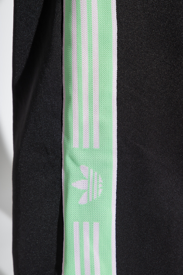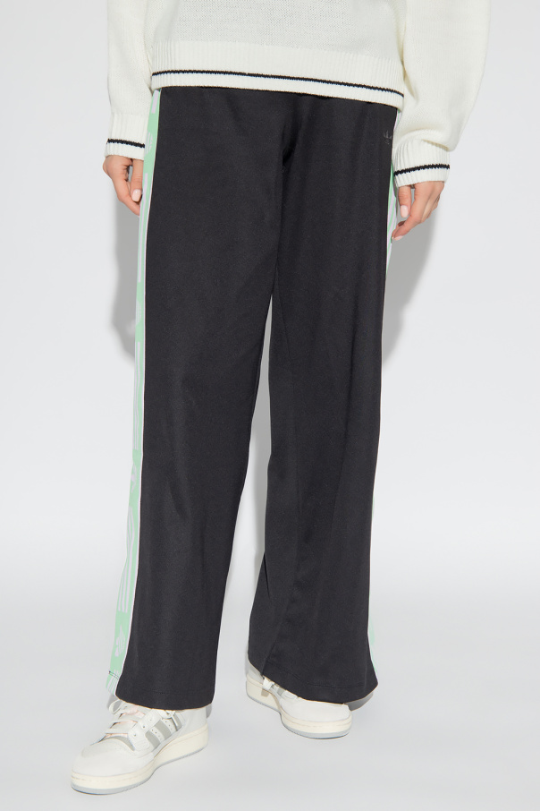 Black trousers from ADIDAS Originals. Crafted from recycled fabric, this pair is complete with a zip and snap closure, side stripes with a logo in green and cream, two slip pockets, two zip pockets and wide legs.