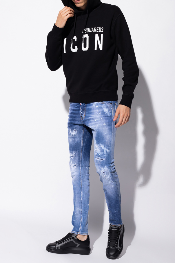 Blue ‘Cool Guy’ jeans from Dsquared2. Falling down with slightly tapered legs, this pair features button fastenings, classic five pockets and the brand's signature distressed effects and paint splatters.