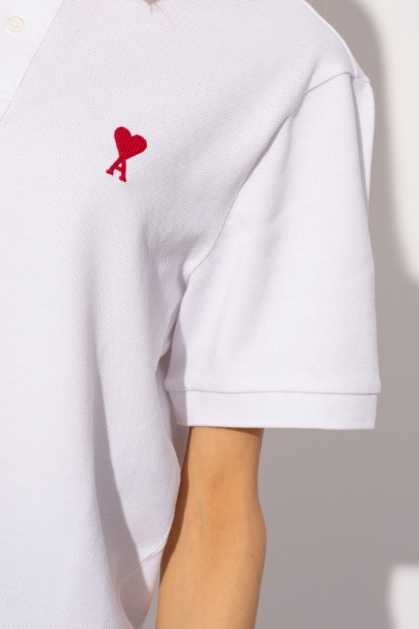 White polo shirt from Ami Alexandre Mattiussi. Crafted from GOTS-certified organic cotton, this style features a collar placket with mother-of-pearl buttons, red ‘ami de cur’ embroidery on the chest, side splits on the hem and short sleeves with elasticated cuffs.