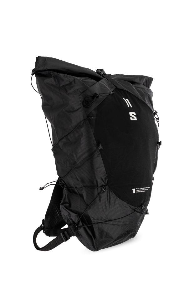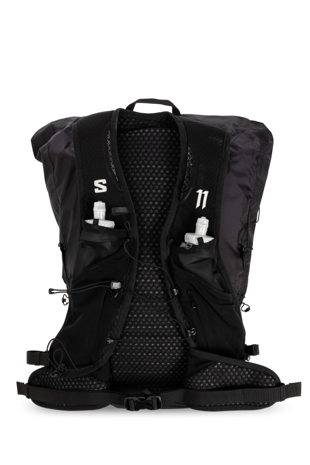 Black '11S' backpack from Salomon x Boris Bidjan Saberi. Crafted from material with high resistance to adverse weather conditions, this design cinches closed with drawstrings and features a snap fastening, a light grey print and logo, one half-round handle, adjustable shoulder straps with a snap-fastened strap and two soft water bottles, multiple pockets, a Motion back system with EVA foam, and one internal compartment with a zip pocket. The hybrid construction combines wide shoulder straps, twin chest straps and SensiFit™ for an adjustable, snug fit and extra stability (3-point attachment).