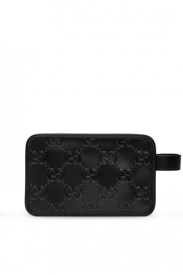Black pouch from Gucci. Crafted from leather, this item fastens with a zip and is complete with an embossed logo pattern, perforations, a slip pocket on the front, a half-round handle and one internal compartment with one snap-fastened pocket.