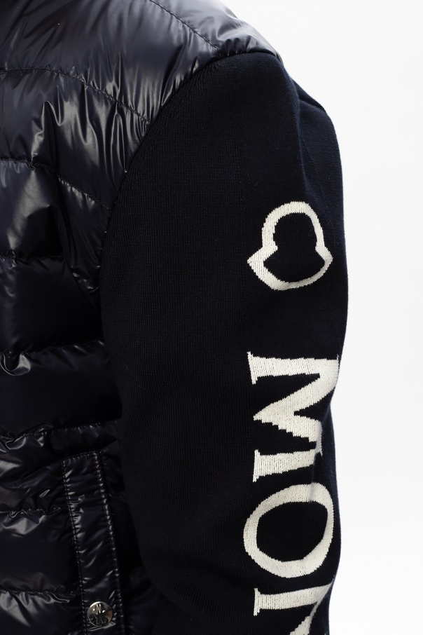 Navy blue quilted cardigan from Moncler. Embroidered with a white logo pattern, this style fastens via a two-way zip and features two snap-fastened pockets and elasticated trims on band collar and long sleeves.