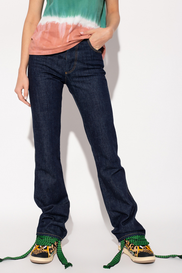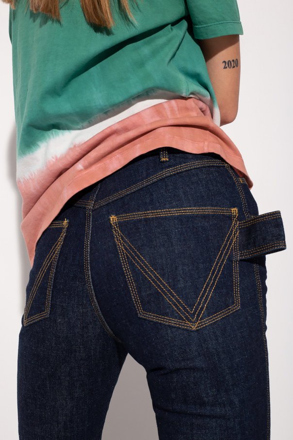 Navy flared jeans from Bottega Veneta. Fastened with buttons, this pair is complete with three front pockets and two back pockets.