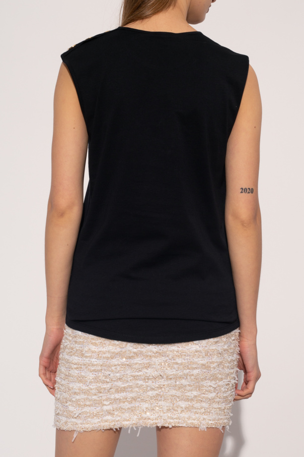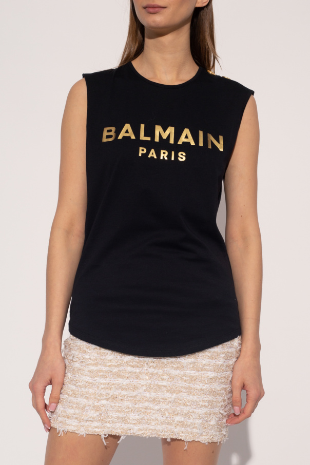 Black top from Balmain. Made of cotton, this round neck design features a gold-tone logo print and decorative logo-embossed appliqués in gold-tone.