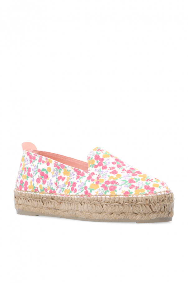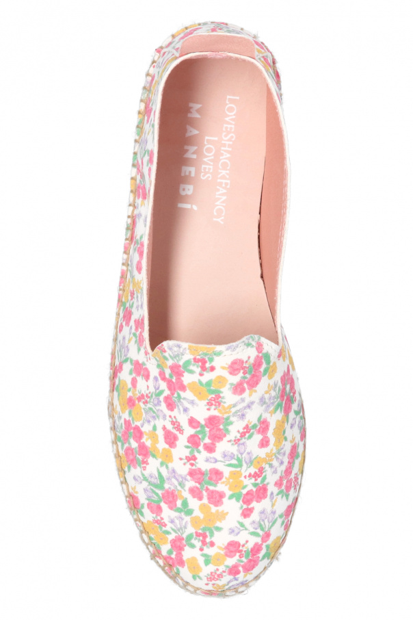 Cream and beige espadrilles from Manebi x LoveShackFancy, the ‘LoveShackFancy Loves Manebí’ collection. Crafted from suede, this model showcases a colourful floral pattern. The sole was made of natural jute trimmed with a thin layer of grey caoutchouc.