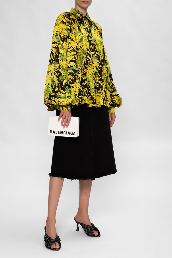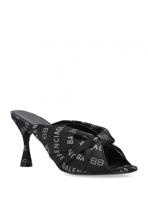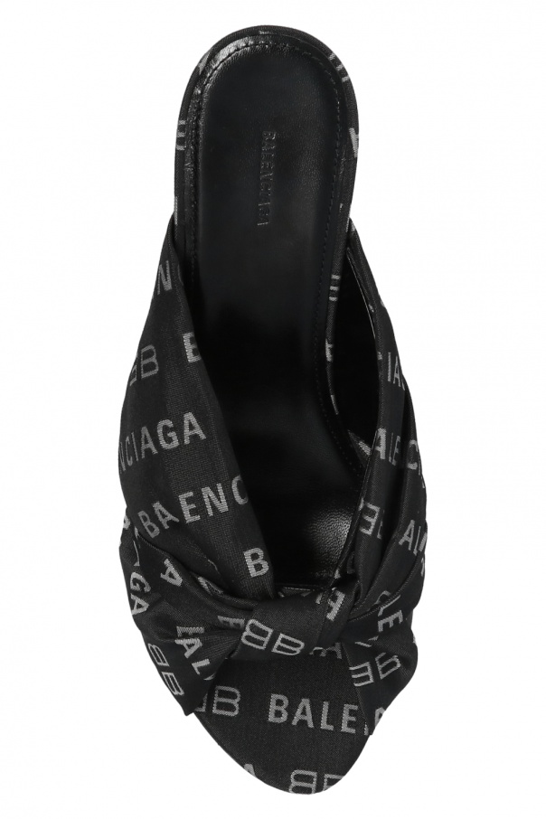 Black heeled mules from Balenciaga. Crafted from leather, this item features fabric trims with an embroidered logo pattern and a black leather sole.