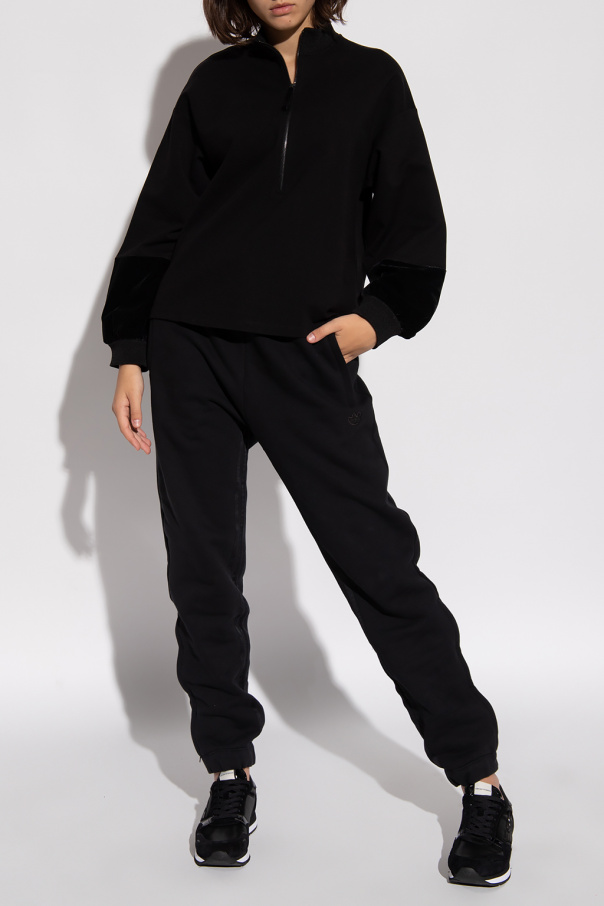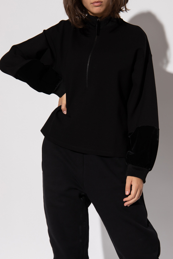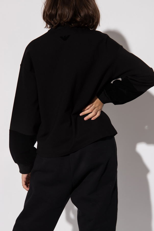 Black sweatshirt with a stand-up collar from Emporio Armani. Cut with an oversize silhouette, this style showcases a metal zipper on the front, a velvet-flocked logo on the back, velvet inserts on the sleeves and elasticized trims on the collar and cuffs.