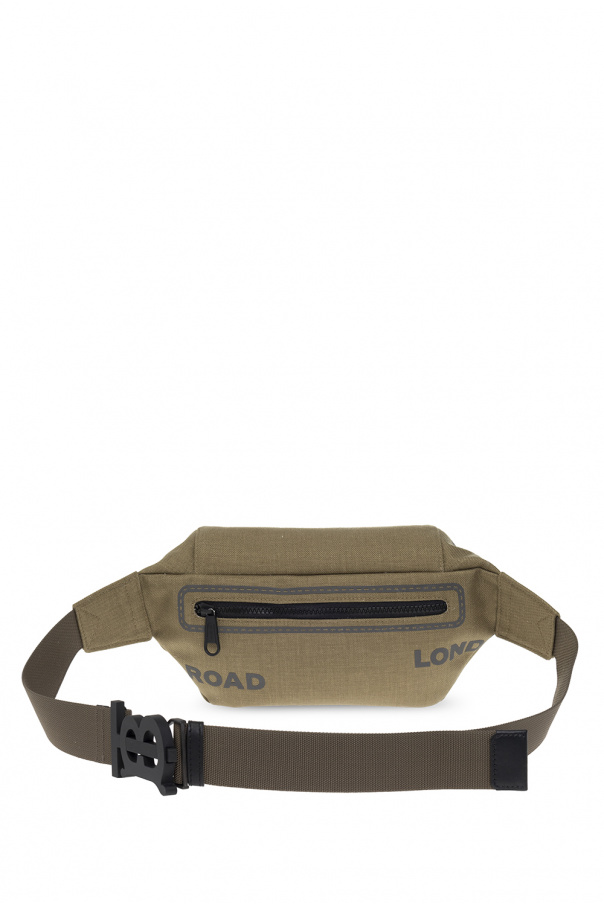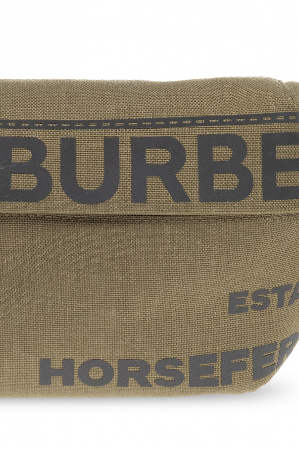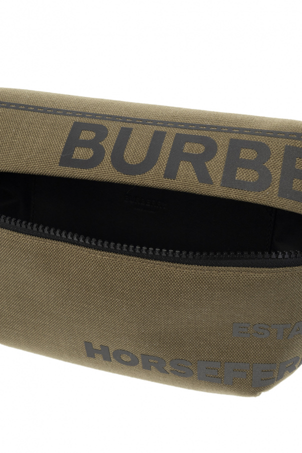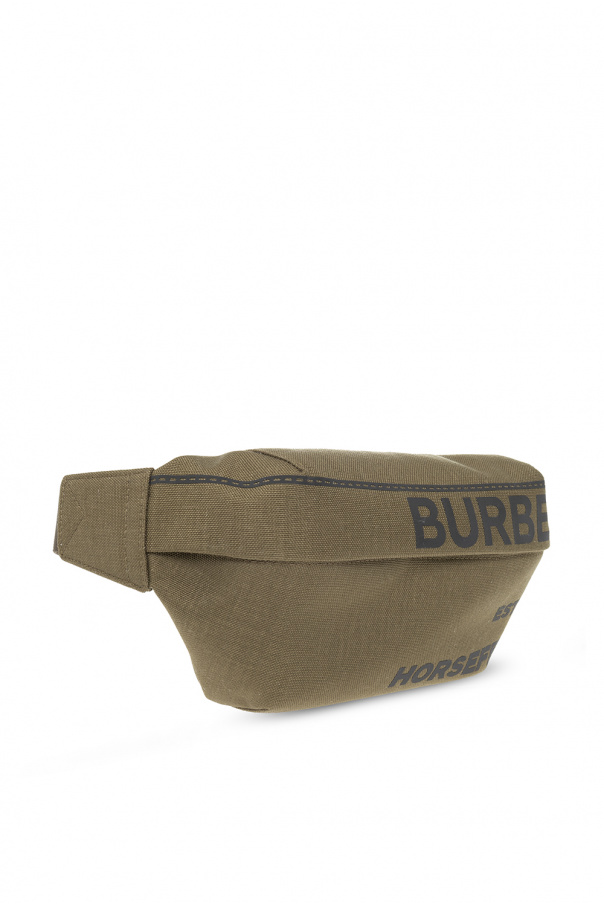 Green ‘Sonny Medium’ belt bag from Burberry. Fastened with a zip, this garment features a reflective Horseferry logo print, back zip pocket, adjustable shoulder strap with a black logo buckle, black metal hardware and one internal compartment with one slip pocket.