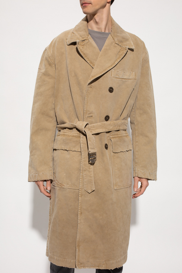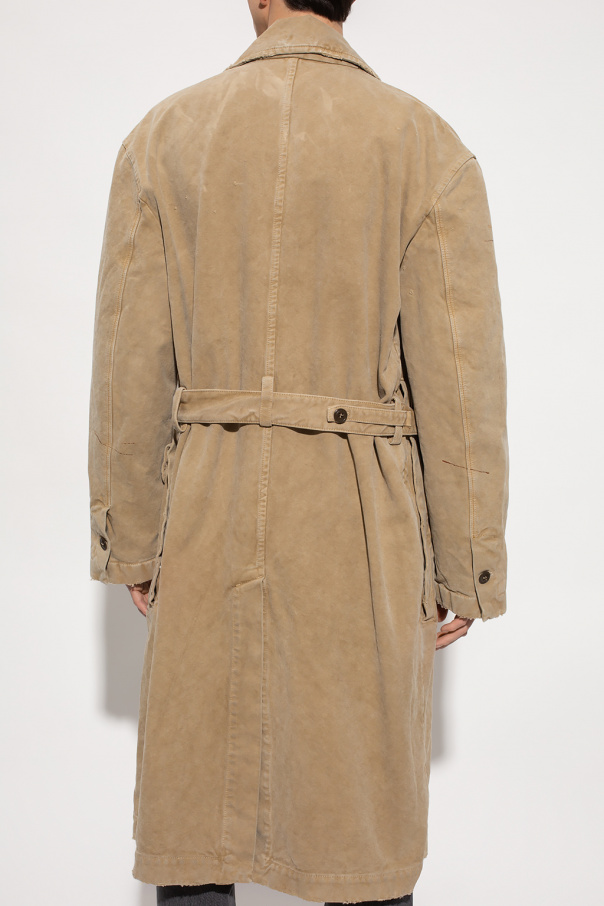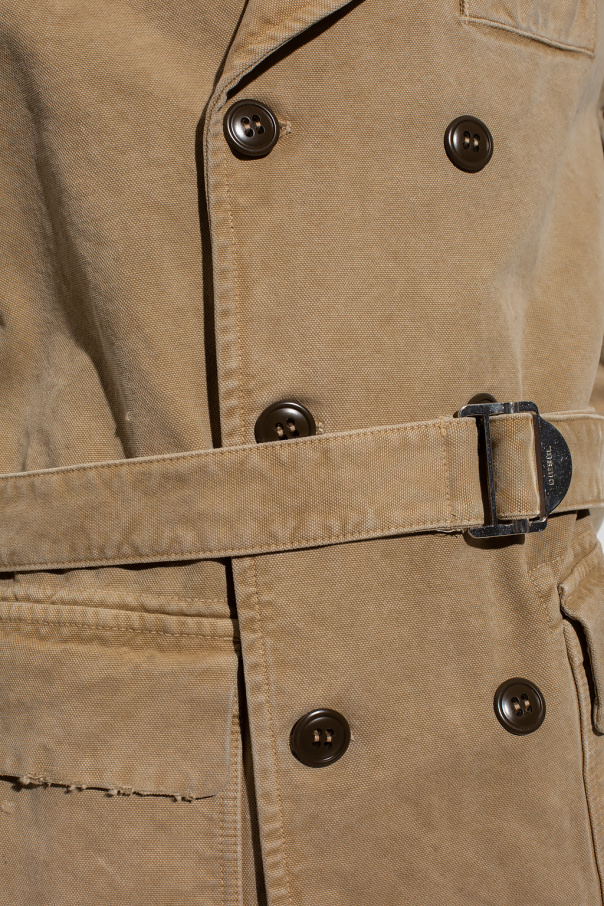 Beige ‘J-Iggy’ double-breasted coat from Diesel. Crafted from cotton with a vintage effect, this style features button fastenings, a belt with a metal logo buckle, an embroidered logo, distressed detailing, smutting, peak lapels, one slip pocket, two flapped pockets, a single back vent and long sleeves with button cuffs.