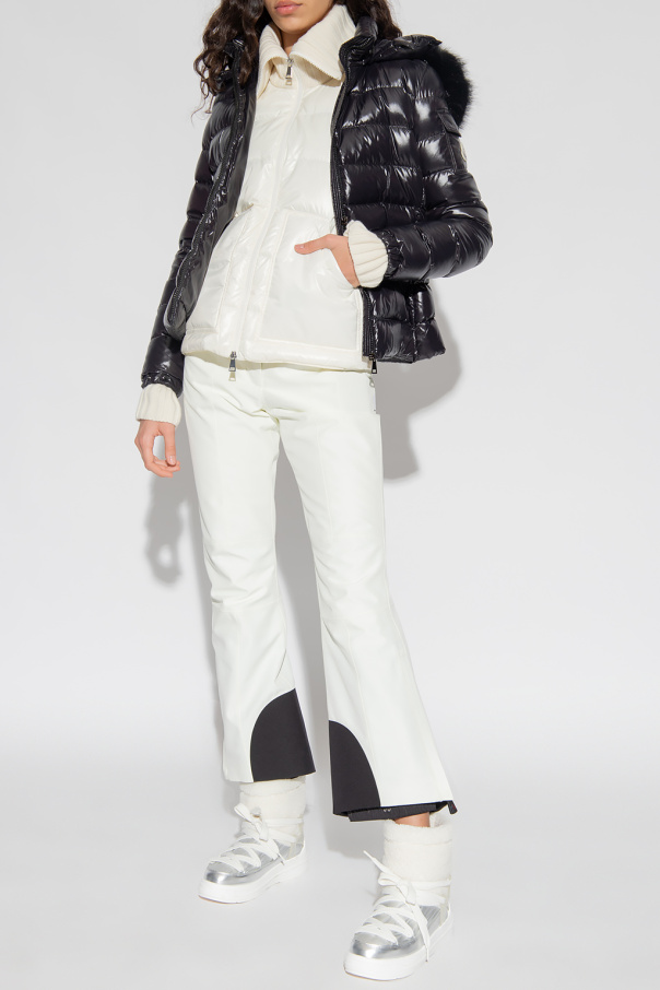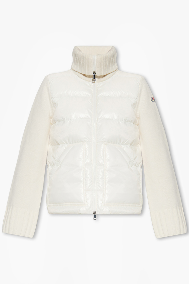 Cream cardigan with a standing collar from Moncler. Made of wool, this style features a quilted front panel padded with natural down and goose feathers with the DIST certificate. It is complete with a two-way zip fastening, a branded shoulder patch, two snap-fastened pockets and long sleeves with elasticized cuffs.