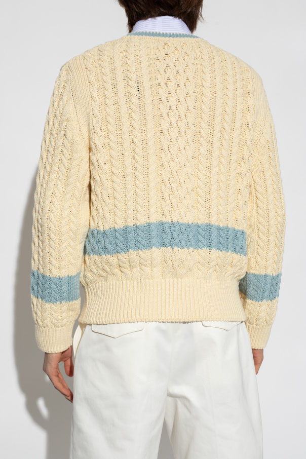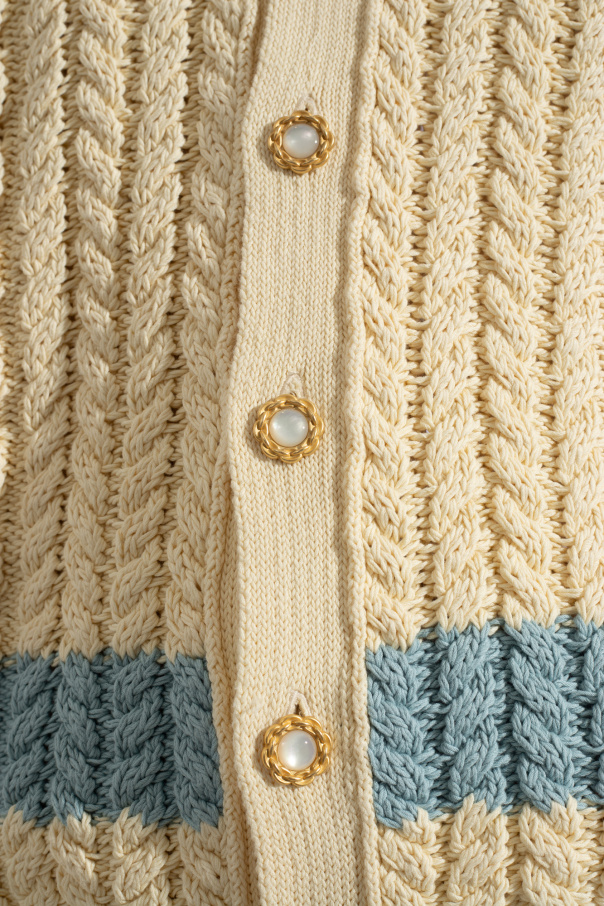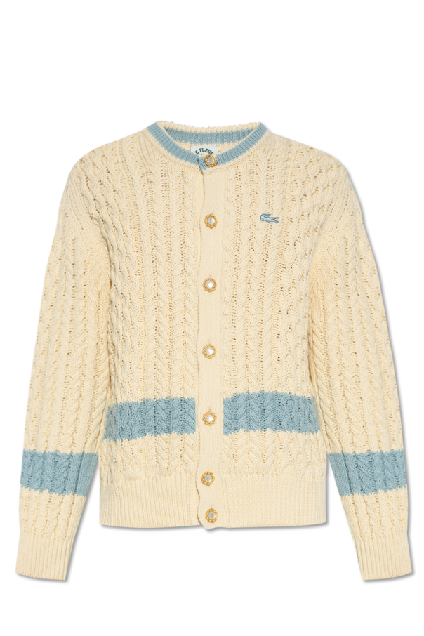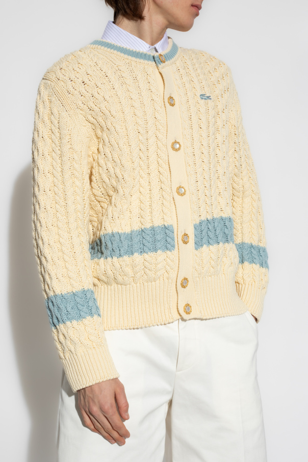 Cream and blue cardigan from Lacoste x le FLEUR. Made of cotton, this design features decorative buttons, a logo patch and ribbed trims at the crew neck, hem and cuffs.