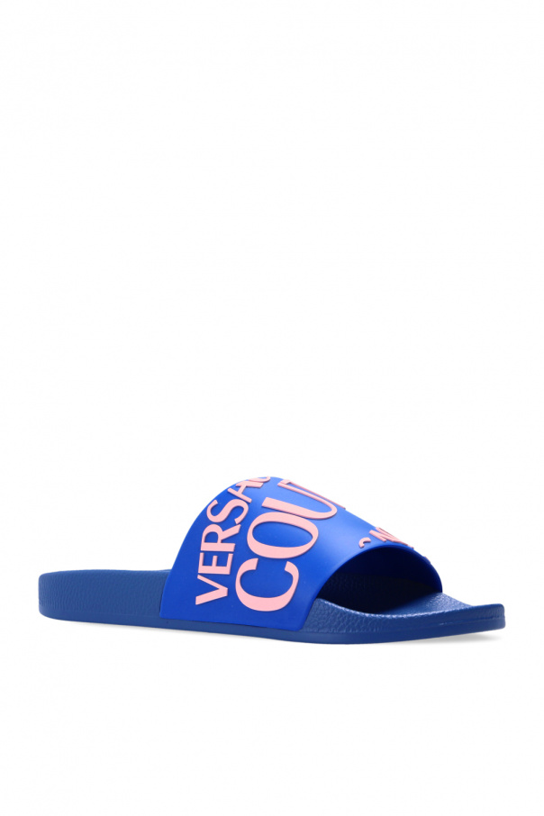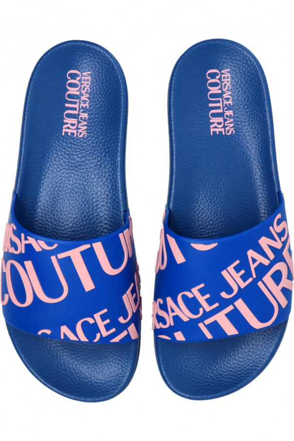 Blue slides with a raised logo in light pink from Versace Jeans Couture. Made of rubber.