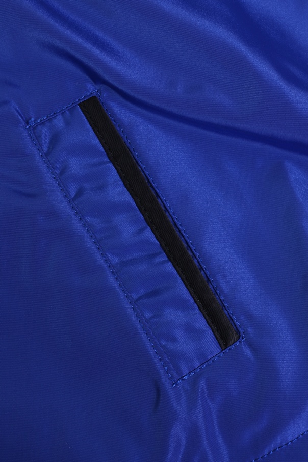 Blue rain cape from Kenzo with a hood. Zip and snap fastening with a concealed placket. 2 front slip pockets. Patch with a signature tiger head on the front. Patterned black and white lining.