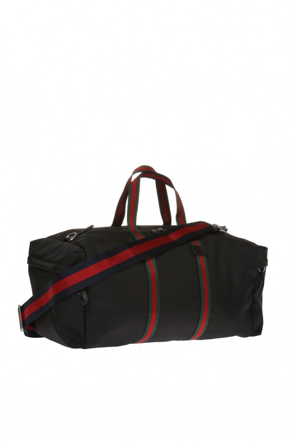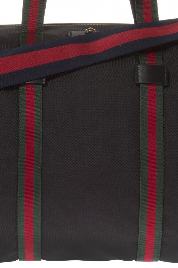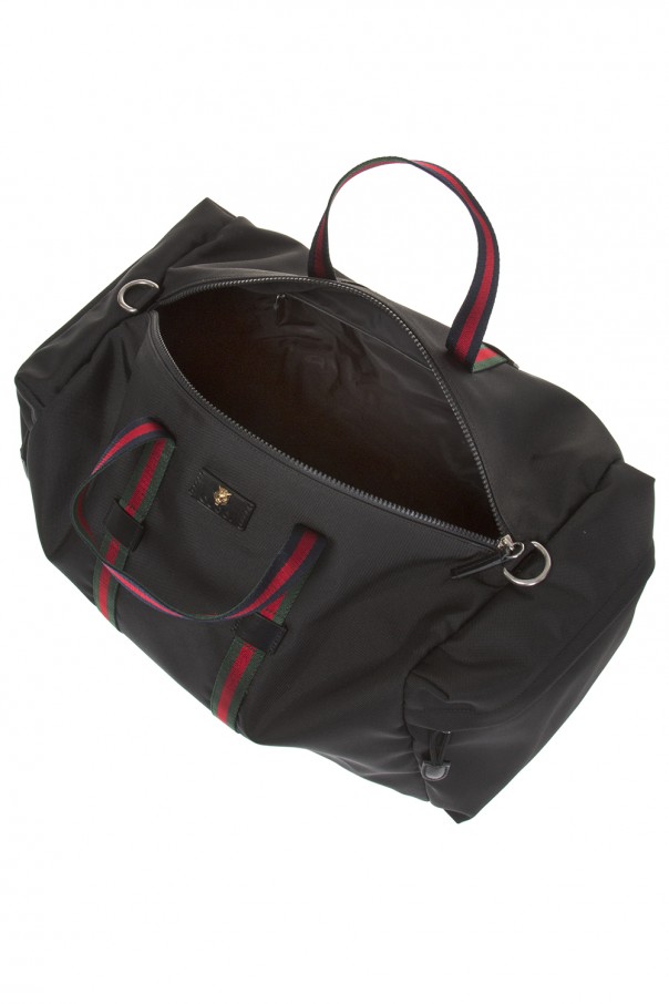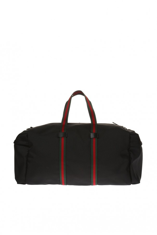 Black canvas holdall from Gucci. Two-way zip fastening. Signature green-red-green 'Web' stripe. Insert with metal cat head on the front. Zip pockets on the sides. 2 semi-round handles. Detachable and adjustable shoulder strap with navy-red-navy 'Web' motif. Black interior with 3 pockets – 1 zipped. Silver-tone metal hardware.