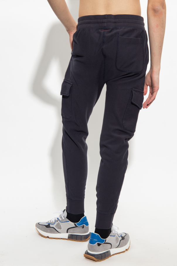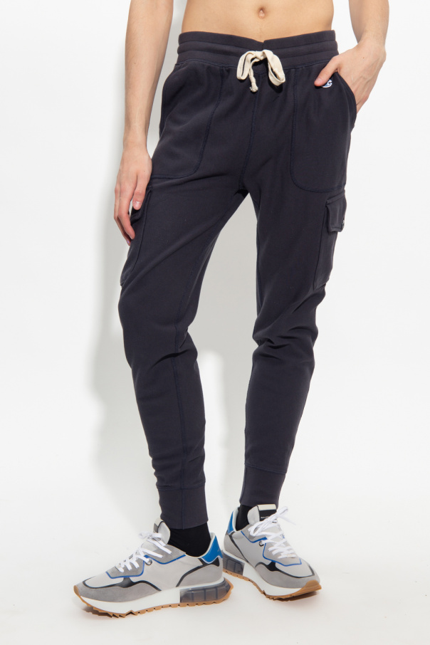 Navy sweatpants from Champion x Todd Snyder. Made of cotton, this garment features an elastic waistband with drawstrings, logo patch, two flap pockets, three slip pockets and slightly tapered legs with ribbed cuffs.