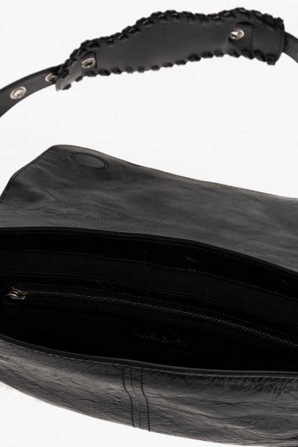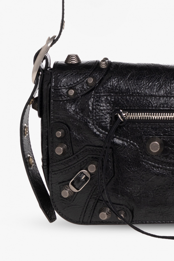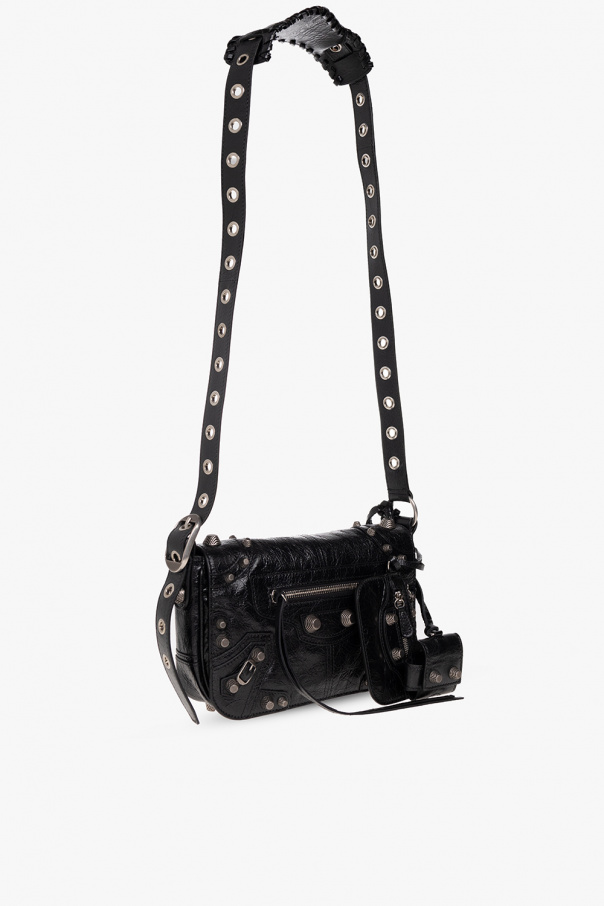 Black ‘Le Cagole XS’ shoulder bag from Balenciaga. Made of lamb leather with vintage effect, this model features a flap with magnetic snaps, zipped front and back pocket with decorative tassels, metal studs, buckles, adjustable shoulder strap and silver-tone metal hardware. Comes with a detachable heart-shaped mirror charm with a logo embroidery and a card holder.
