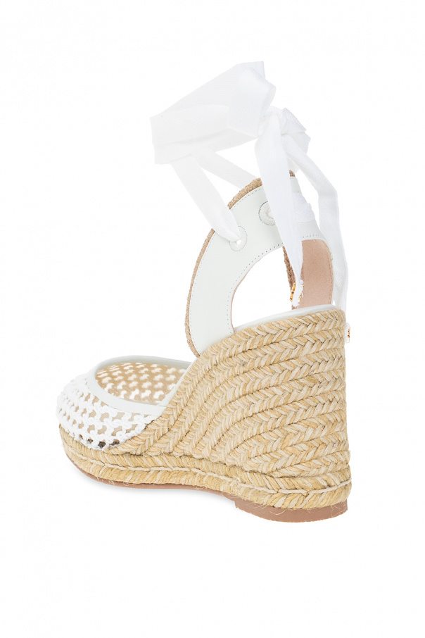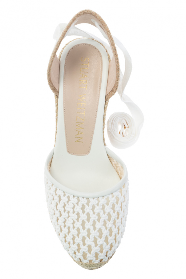 White and beige ‘Marguerita’ wedge shoes from Stuart Weitzman. Crafted from calf leather and decorative chiffon, this model features a drawstring ankle, a jute-style overlay and a light brown rubber sole.