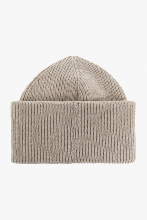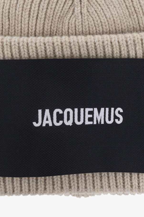 Light beige beanie with a black and white logo patch on the front from Jacquemus. Made of wool.