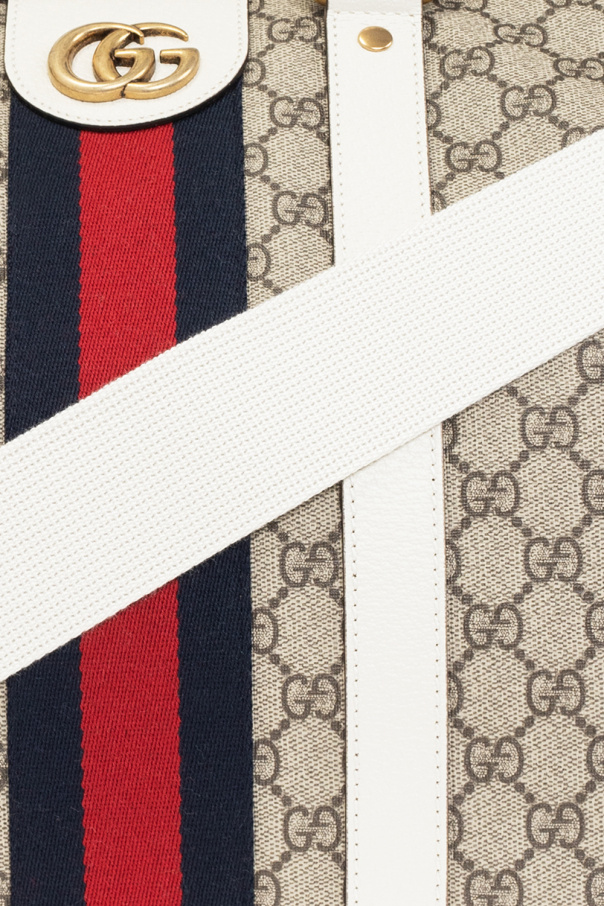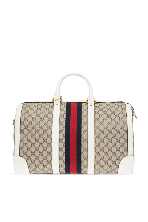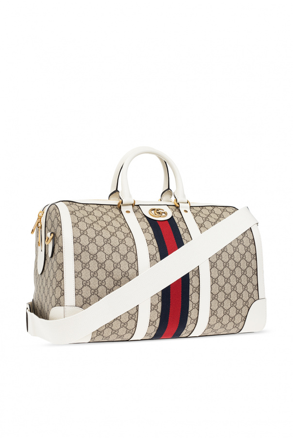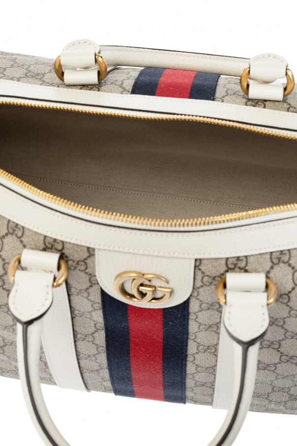 Beige and brown ‘Ophidia Medium’ holdall bag from Gucci. Crafted from the iconic GG Supreme canvas with textured cream leather trims, this model fastens with a two-way zip and is decorated with a printed metal logo and Web stripe in navy and red. It is complete with two half-round handles and one internal compartment with cream lining, two slip pockets and one zip pocket.