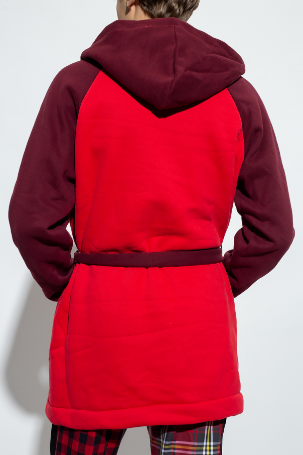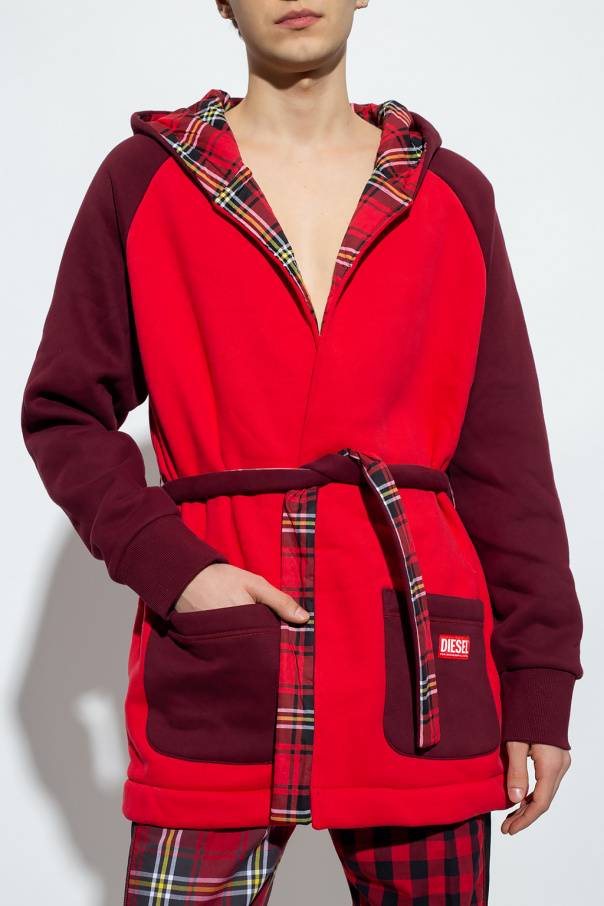 Red and maroon ‘Jas Homey’ hooded bathrobe from Diesel. Fastened with a maroon and red strap with a check pattern, this garment features two maroon front pockets with a logo patch as well as long sleeves with ribbed cuffs.
