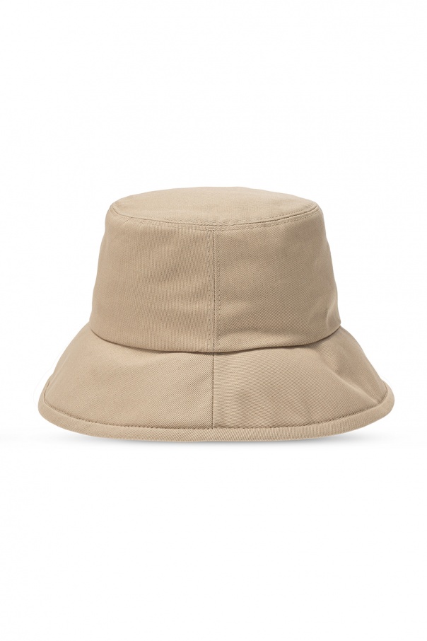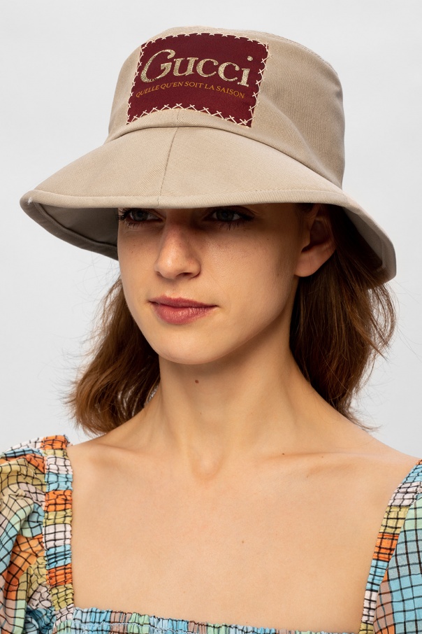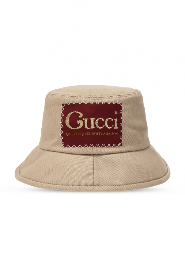 Beige hat from Gucci. Made of cotton, this exemplary piece of headwear is enriched by a red, gold-tone and white logo appliqué.