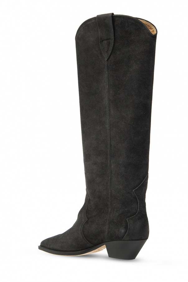 Black 'Denvee’ heeled knee-high boots from Isabel Marant. Crafted from calf leather with a pointed toe silhouette, they sit on a black and beige leather sole.