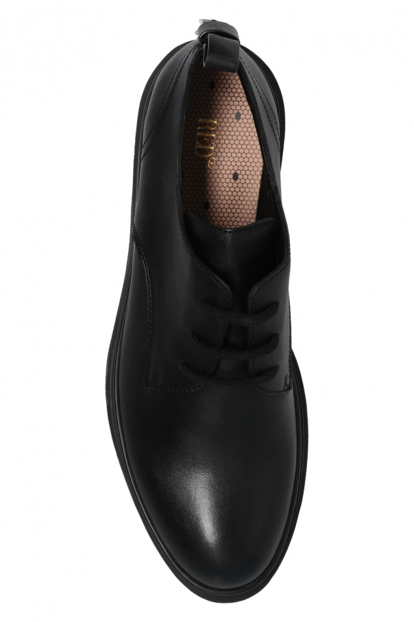 Black shoes from Red Valentino. Crafted from leather, this lace-up model sits on a black transparent rubber sole and features a maroon pattern with the brand's logo and an almond-shaped toe.
